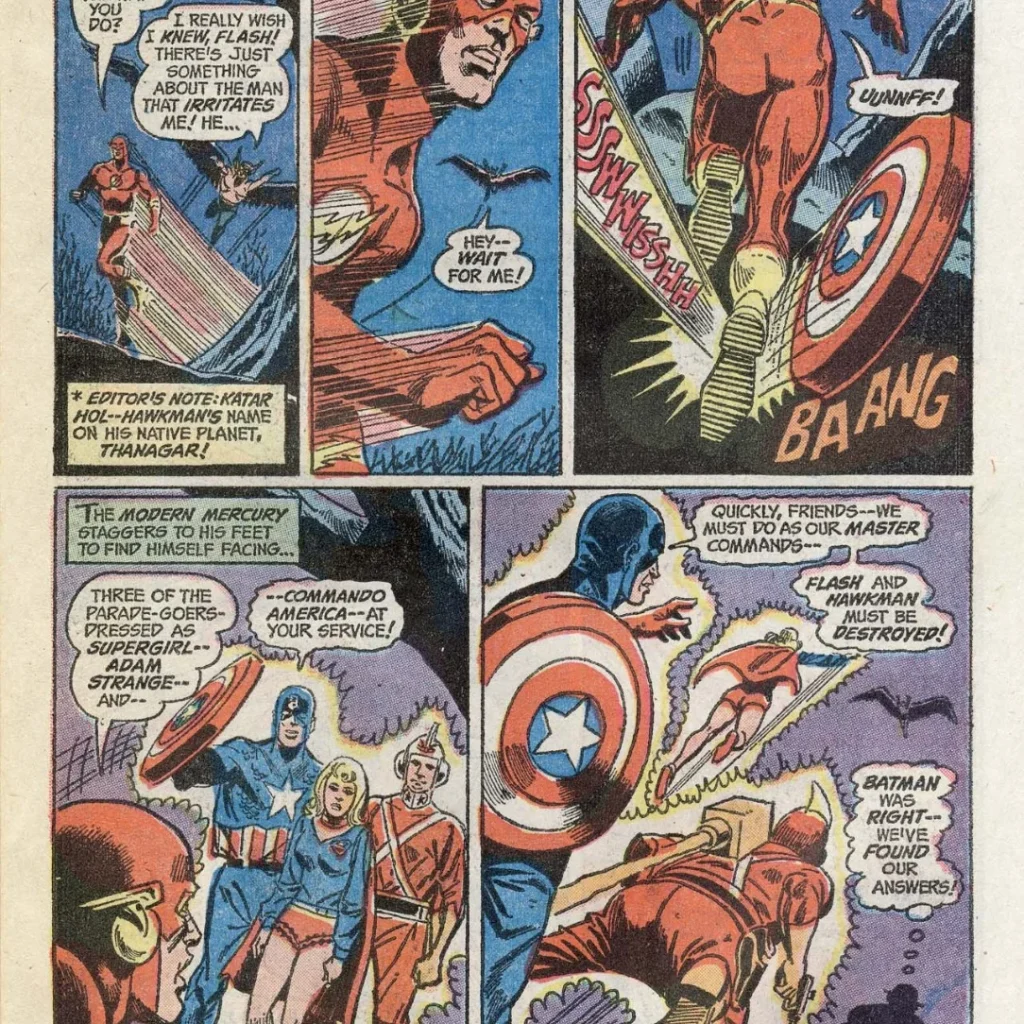 En esta ocasión nos centraremos en el primer crossover de Marvel y DC. Los fans de antaño dirán: “Bah, todos sabemos que fue Superman vs. Spider-Man”. Pues no, no fue así. De hecho, ni siquiera fue de superhéroes, fue de escritores: Gerry Conway, Len Wein y Steve Englehart, quienes trabajaban en ambas compañías. Lo que hicieron fue agregarse como personajes secundarios (junto con Glynis Wein) y ser parte de una subtrama que los llevó de Amazing Adventures #16 (Marvel), pasando por Thor #207 (Marvel), y concluyendo su aventura en Justice League of America #103 (DC), todo esto en 1972.